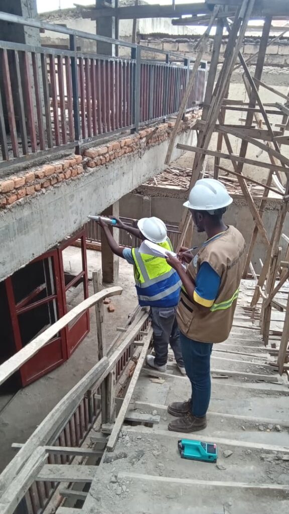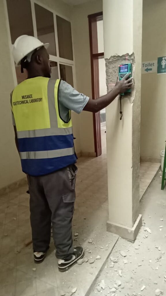 The engineer is carrying out a structural inspection on the column using a Schmidt Hammer (Concrete Rebound Hammer) to check concrete strength without damaging the surface. This helps confirm the structure’s stability and detect any weak areas early. The assessment supports quality control, safety, and the long-term performance of the building.